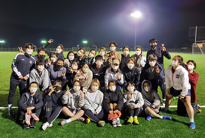 권성호(체육교육92-96) 지도교수(체육교육과)의 대학원 제자이자 대학 축구부 출신인 이승주 감독과 양경진 코치가 무보수로 훈련을 이끌고 있다. 이승주 감독은 “축구를 해본 학생과 처음 해보는 학생을 함께 지도하려니 고민이 있었는데, 코치 영입 후 기본기 훈련이 수월해져 초보 학생도 2~3달이면 따라온다. 대회에 앞서 전술 훈련에 집중한다”고 했다. 선전 비결로는 승부욕을 꼽으며 “훈련 시간도 절대적으로 부족하고, 체대 중심의 타팀과 겨뤄야 하지만 그럴수록 ‘꼭 이기자’고 똘똘 뭉친다. 대회 때마다 ‘원팀(One Team)’이라는 것을 강하게 느낀다”고 설명했다.