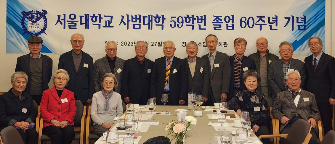 사범대학 59학번 동문들이 2월 27일 호암교수회관 체리홀에서 졸업 60주년 기념행사를 열었다. 이날 행사는 김학천(독어교육59-63) 동문과 이동호(교육59-63) 동문이 주도해 개최됐다. 2019년엔 입학 60주년을 기념해 모임을 열기도 했다.