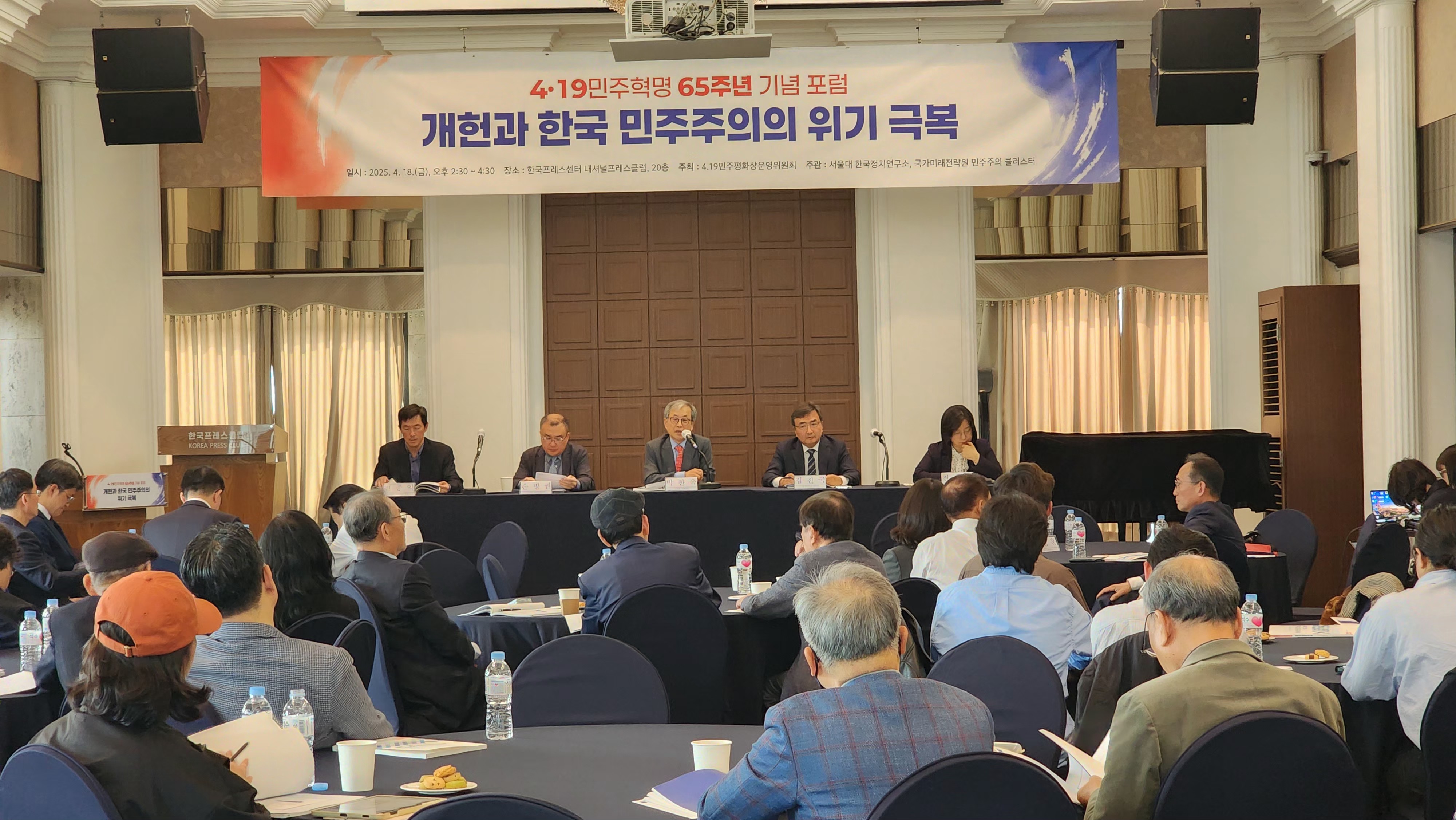 4월 18일 서울 중구 한국프레스센터 내셔널프레스클럽에서 4·19 민주혁명 65주년을 기념해 포럼이 개최됐다. 서울대 국가미래전략원 민주주의 클러스터와 한국정치연구소가 ‘개헌과 한국 민주주의의 위기 극복’을 주제로 연 이번 포럼은 한국 민주주의의 현재 위기를 진단하고, 이를 해결하기 위한 개헌과 정치개혁 방향을 심층적으로 논의하는 장이 됐다.