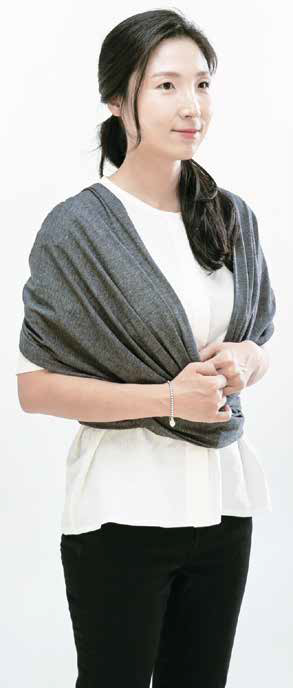 코니 아기띠는 꼭 티셔츠나 숄 같다. 디자인이 단순하니 착용시 스타일을 망친다는 ‘자괴감’이 덜하다. 엑스(X)자로 된 천을 엄마가 먼저 입고 가운데 아기를 쏘옥 넣어 안는데, 무게 200g이 안 되는 이 천 제품이 신생아부터 20kg까지 너끈히 견딘다. 재봉도, 원단도 모르던 그가 아이 업고 다니며 직접 개발한 원단이다.