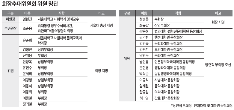 서울대총동창회(회장 김종섭)는 9월 18일 서울 한국프레스센터에서 제31대 회장 및 감사 선출을 위한 제1차 회장추대위원회를 열고 추대위원장으로 임현진(사회67) 서울대 명예교수를 선출했다. 부위원장은 조순용(동양사71) 전 대통령 정무수석이 선임됐다.