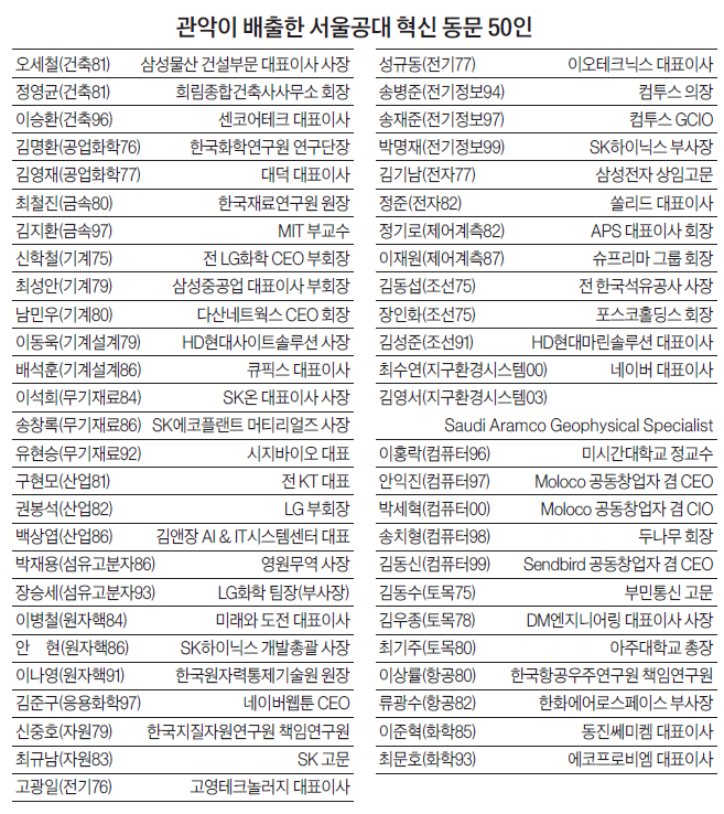 공과대학(학장 김영오)이 관악캠퍼스 개교 이후 입학한 동문 가운데 기술 혁신과 사회 발전에 기여한 ‘관악이 배출한 서울공대 혁신 동문 50인’을 12월 18일 발표했다.