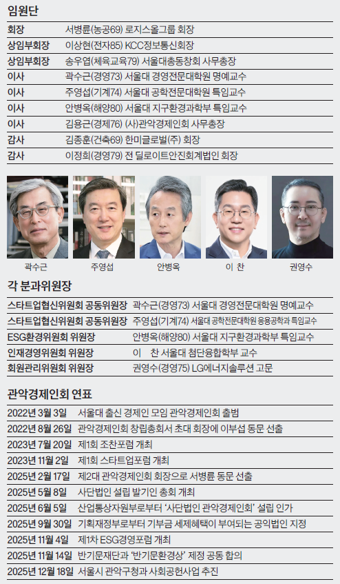 관악경제인회는 서울대학교 총동창회 산하 경제인 직능 단체로 출범해, 서울대 출신 기업인·전문경영인·창업가·전문직 종사자를 잇는 네트워크로 성장해왔다. 이 조직이 내세우는 강점은 동문 경제인들이 쌓아온 경험과 자원을 모교와 사회에 환원하고, 그 과정에서 후배 세대를 키우는 구조를 만들어가고 있다는 점이다
