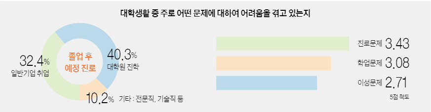 대학 생활에서 학생들은 ‘진로 문제’로 인해 가장 어려움을 겪고 있는 것으로 나타났다(3.43점/5점 척도). 대학생활문화원이 학부 졸업생을 대상으로 대학생활 의견조사를 실시한 2009년 이래, ‘진로 문제’는 매년 학생들의 가장 큰 고민을 차지하고 있다.