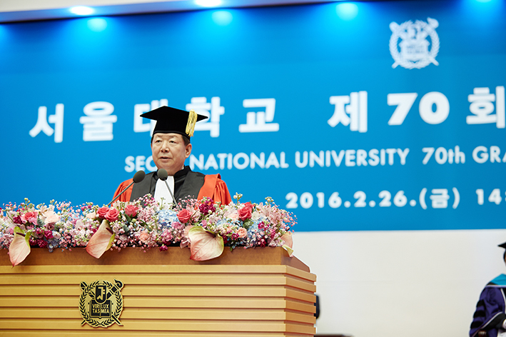 올해는 서울대가 우리나라 고등교육과 학문창달의 기치 아래 국립 종합대학교로 설립된 지 70주년이 되는 해입니다. 서울대의 졸업생들은 나라가 어려울 때마다 난관과 역경을 헤쳐 나갈 지혜를 제시하였고, 격동의 시대에는 변화를 위한 몸부림의 선두에 서기를 주저하지 아니하였습니다. 그리고 오늘 졸업생들은 이렇게 자랑스러운 서울대에서 학사·석사·박사학위를 취득함으로써 역사의 당사자가 되었습니다.