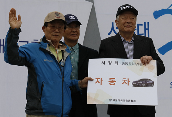 어젯밤 무슨 꿈 꾸셨어요?”서정화 회장이 협찬한 자동차 경품에 당첨된 이영진 동문(왼쪽).