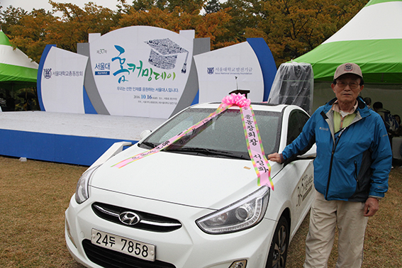 서정화 회장이 협찬한 자동차 경품에 당첨된 이영진 동문이 포즈를 취했다.