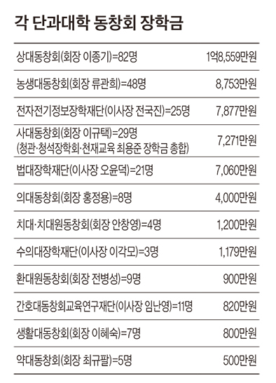 상대동창회가 82명에게 1억8,559만원을 지급해 장학생 수뿐 아니라 장학금 총액 면에서도 가장 많았다. 이어 농생대동창회가 48명에게 8,753만원을, 전자전기정보장학재단이 25명에게 7,877만원을 지급했다. 전자전기정보장학재단은 학과 단위 동문회의 재단임에도 불구하고 장학금 총액 3위, 1인당 장학금액 315만원으로 4위를 기록해 여느 단대 못지않은 규모를 자랑했다.