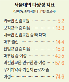 이날 노정혜 위원장의 발표에 따르면 2016년 기준 서울대 교원 2,301명 가운데 여자 교원은 373명으로 약 15%에 불과하다. 사립대학의 여성 전임 비율은 25%, 하버드대는 29% 수준이다. 전임 교원 중 타 대학 출신 비율은 14.4%다. 노 위원장은 “집단 지성과 연결되는 다양성이라는 가치는 단순히 인식의 변화에 그치는 것이 아니라 실제 조직에 이익을 가져다 준다는 점에서 의미가 있다”며 “다양성이 능력을 이긴다”고 강조했다.