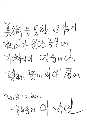 지난 본회 특별전시회에 방문한 이낙연 총리의 방명록. 구 동문에게 간단한 필적 분석을 부탁했다.