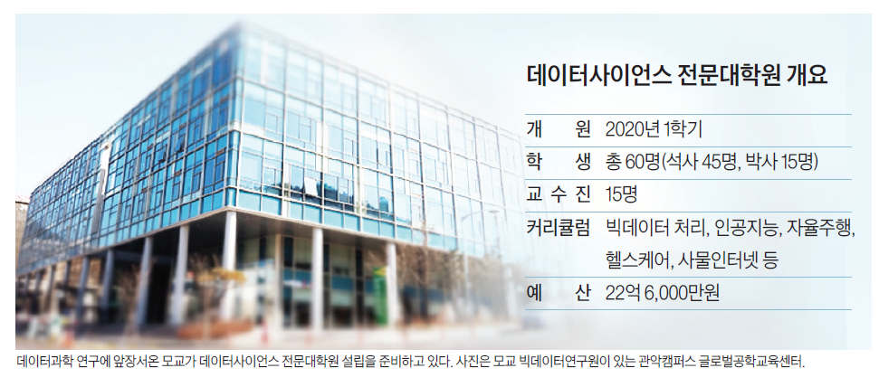 모교에 국내 첫 빅데이터와 인공지능(AI) 전문대학원이 들어선다. 모교는 오는 2020년 봄학기 빅데이터, AI, 자율주행 등 4차 산업혁명의 핵심 기술을 전문적으로 교육하는 데이터사이언스 전문대학원을 설립한다고 최근 밝혔다. 성균관대 등 일부 대학이 일반대학원에 데이터사이언스 관련 학과를 개설한 적은 있지만 독립된 전문대학원을 설립하는 것은 모교가 처음이다.